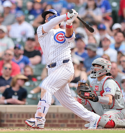 フィリーズ戦の8回、ソロ本塁打を放つカブスの鈴木。4打数3安打1打点、2四球だった。カブスは延長10回、8―7でサヨナラ勝ちし、9連勝とした=23日、シカゴ 【AFP時事】