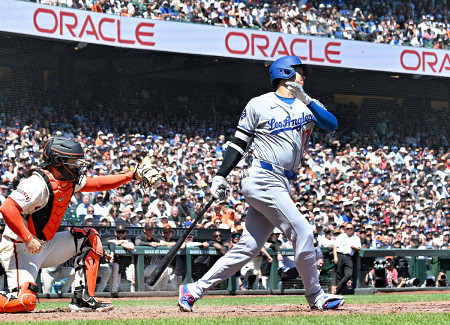 ジャイアンツ戦の4回、三振に倒れたドジャースの大谷。1番指名打者(DH)で出場し、5打数無安打、2三振。チームは3―0で勝ち、3連敗を免れた=23日、サンフランシスコ 【時事通信社】