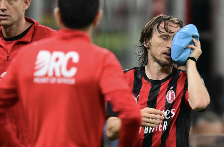 サッカーのイタリア1部リーグ、ACミランは27日、クロアチア代表MFルカ・モドリッチが左頬骨(きょうこつ)を骨折し、手術を受けたと発表。写真はユベントス戦で負傷したモドリッチ=26日、イタリア・ミラノ 【AFP時事】