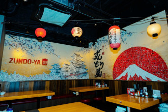 外には、看板商品だという「味玉らーめん」の写真を大きく掲出し、「ZUNDO-YA」の文字が入ったちょうちんを飾る。店内は「MATSURI」をテーマに、木を使った空間に白と赤のちょうちんで装飾する。壁には、一部に使わなくなった丼の破片を使ったモザイクアートを施す。
