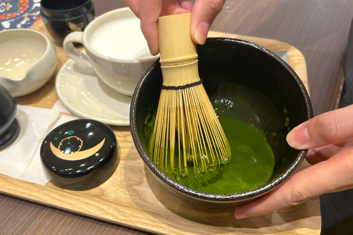 「自分で点てる抹茶のアフタヌーンティー」の提供が11月1日、なんばパークス2階の「Cafe Pandish」で始まる。抹茶をたてる様子