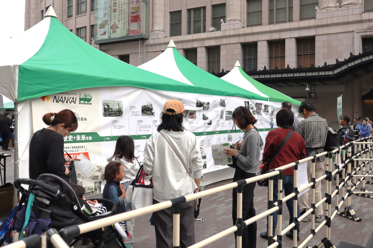 南海電鉄140周年記念イベント「スペシャルサンクスフェスタ in なんば広場」が11月2日、なんば広場で行われた。歴史年表を見ながらクイズに挑戦する来場者
