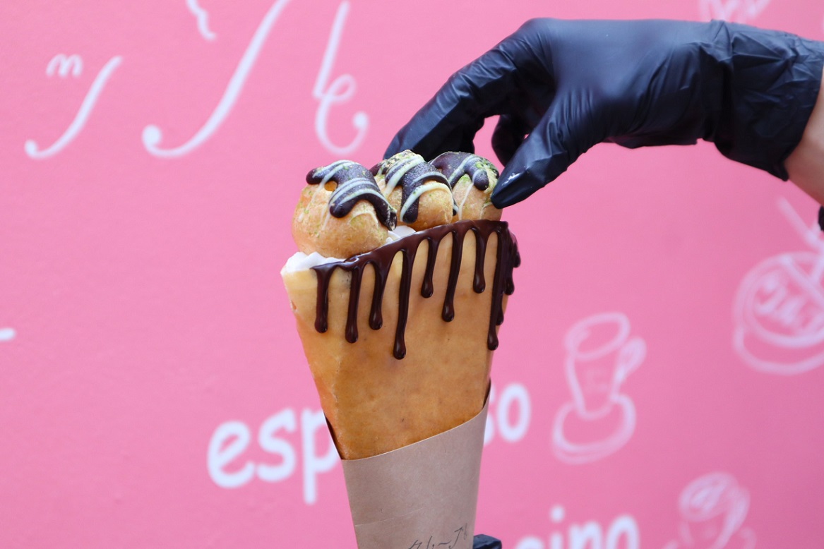 プチシューを並べる同店限定の「たこやきちゃうでプチシューdeクレープと」