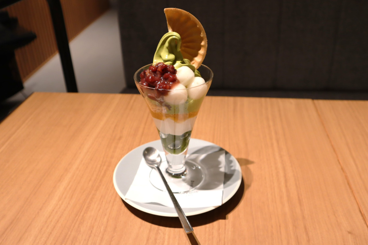 抹茶ソフトを絞ったパフェ「あずき白玉」