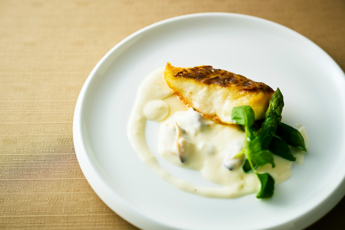 シェフパフォーマンスコーナーで提供する「タイのポワレ アサリのクリームソース」(4月)