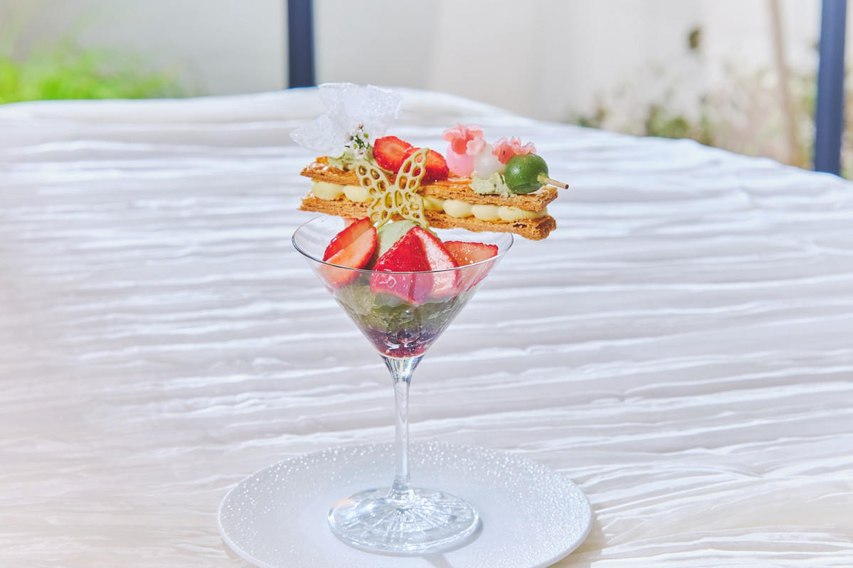 「初夏のいちごと抹茶アフタヌーンティー」が5月1日、結婚式場「セントグレースヴィラ心斎橋」で始まる。オプションで用意する「いちごと抹茶のミルフィーユパフェ」