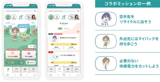 左:モアクトのアプリ内コラボデザイン(イメージ) 右:社会貢献に繋がるコラボミッション例