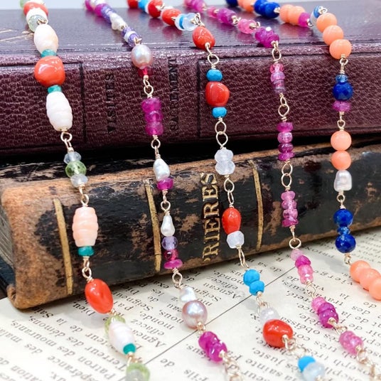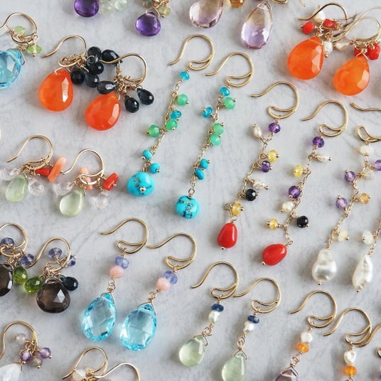ターコイズ、真珠、カーネリアン、プレナイト、スイスブルートパーズなど、異なる個性をもつ天然石を組み合わせたデザインです。