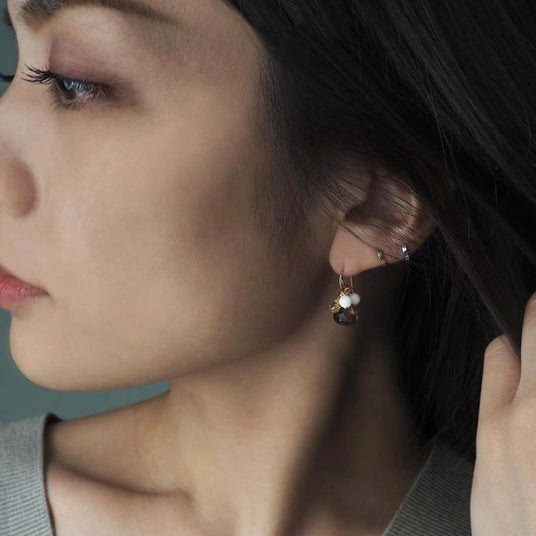 小粒の宝石がふわりと揺れ、木の実や花を思わせる柔らかな表情を描きます。金線をねじり留める“シャンク巻き”の技法を用い、職人が一石ずつ繋ぎ仕立てた繊細な仕上がり。ジュエリーとしての強度と、地金がもたらす上質な存在感を両立させるため、フック部分もオリジナルで制作しています。