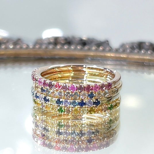 色とりどりの宝石を組み合わせた配色は、すべて一点もの。同じものが二つとない唯一無二の彩りが、手もとに軽やかな表情を添えます。