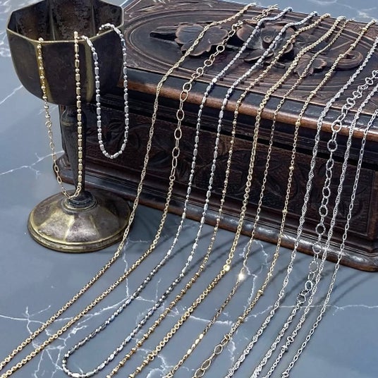 煌めきの強いチェーンを単体で仕立てたものに加え、2~3種類のチェーンを繋ぎ合わせ、ひと筋の中で異なる表情を描くデザインもご用意。ホワイトゴールドとイエローゴールドを組み合わせたタイプは、華奢な印象の中に奥行きを生み出し、冬の装いにも軽やかに映えます。