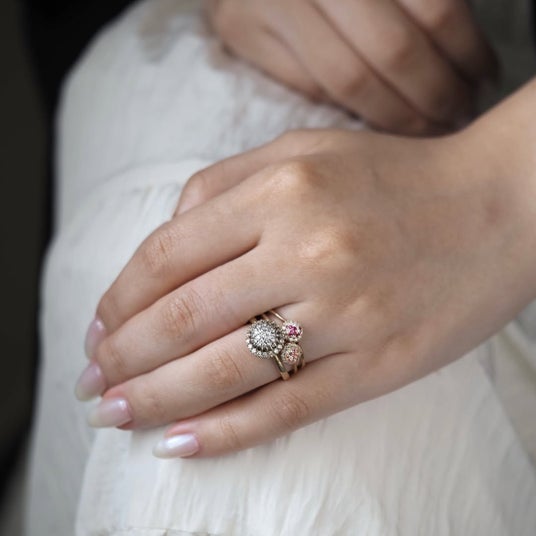 PARCELLE JEWELRYのパヴェは、単なる石留めではなく、地金の余白までも計算に入れた精緻な職人技の結晶です。指先ほどの小さな世界に、17石のダイヤモンドとカラーストーンを一石ずつ丁寧に留め上げ、光の粒が重なり合うことで生まれる奥行きと色彩のハーモニーを描き出しています。