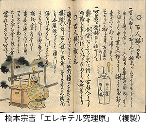 江戸時代の大阪で活躍した蘭学者・橋本宗吉(1763~1836)の著書です。宗吉は、オランダの書物を翻訳して静電気を科学的に研究し、「日本の電気学の祖」とも言われます。本書では、現代でも有名な「百人おどし」など18の静電気実験を紹介していて、まさに江戸時代の静電気実験名人です。
