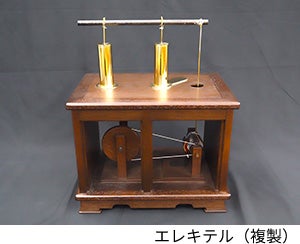 摩擦による静電気発生装置「エレキテル」は、西洋で発明され、江戸時代の日本にも輸入されました。のちに、平賀源内が自作するなど、国産品も作られました。本展では、大阪の蘭学者・橋本宗吉が作ったエレキテルの複製品を展示します。ガラスと皮を摩擦する内部構造も見ることができます。