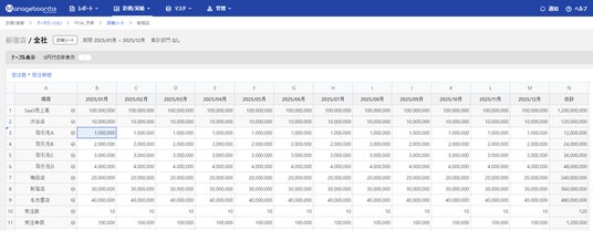 シートの追加、セルへの数式入力、コピー&ペーストなど、使い慣れたスプレッドシートと同様の直感的な操作で計画値の入力や編集が可能です。入力された値は自動で集計・保存されます。