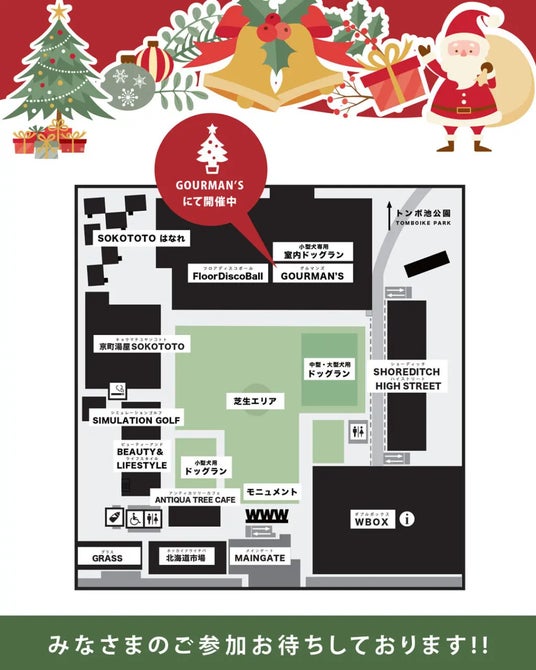 大きなクリスマスツリーやギフトボックスと並んだフォトスポットを設置し、家族写真やSNS投稿にもぴったりです。